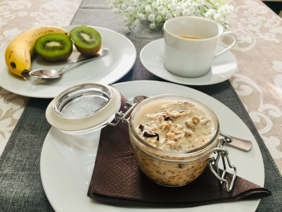 3º. Añade la mezcla líquida al cuenco con los copos de avena y la chía e intégralo todo. En este punto puedes ponerle un poco de chocolate negro. Las pastillas de chocolate con un 85% de cacao son ideales por su bajo contenido en azúcares y su delicioso sabor, que casa a la perfección con nuestras gachas de avena. Eso sí, parte bien cada pastilla antes de mezclarla con las gachas.