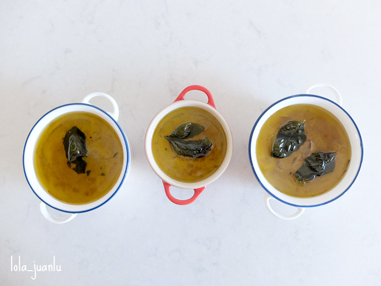 Echamos todo en el cazo de un procesador de alimentos o licuadora y batimos hasta que quede suave. Notaremos que el color cambia de inmediato. Lo probamos y rectificamos de sal y pimienta, si es necesario. Tenemos que tener en cuenta que, al enfriarse, el sabor se hará más suave.