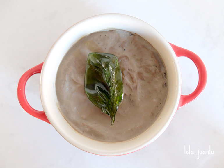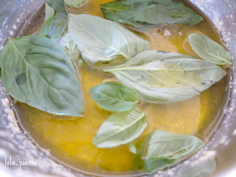 Ponemos el cazo, con el suero de mantequilla, a fuego medio y agregamos unas hojas de orégano, cuando las hojas se vuelvan crujientes quitamos la sartén del fuego. Esto hará que el suero de mantequilla adquiera el aroma y sabor del orégano.