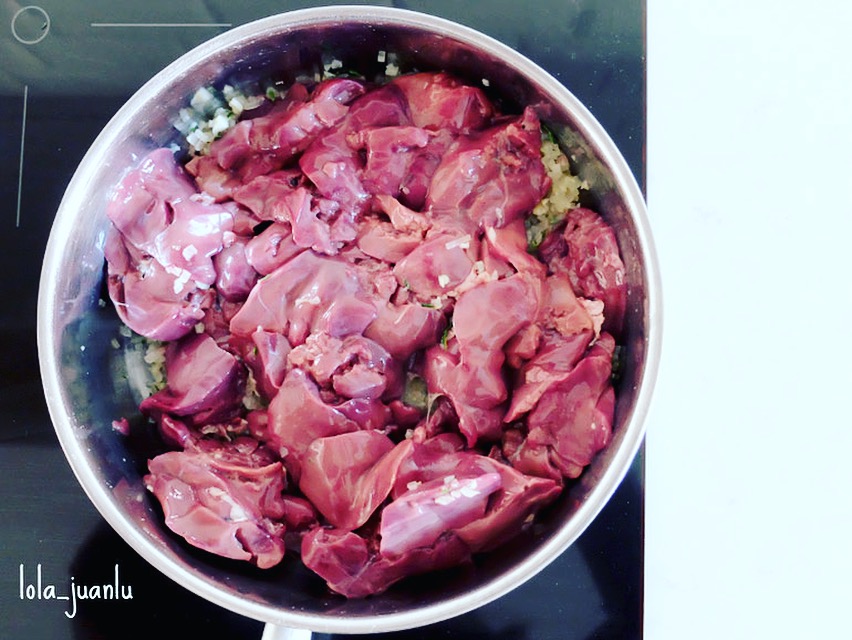 Agregamos los hígados de pollo y la nuez moscada, salpimentamos y cocinamos durante unos minutos, hasta que los hígados adquieran un tono marrón en el exterior y tengan un color rosa en el centro, sin hacerlos en exceso.