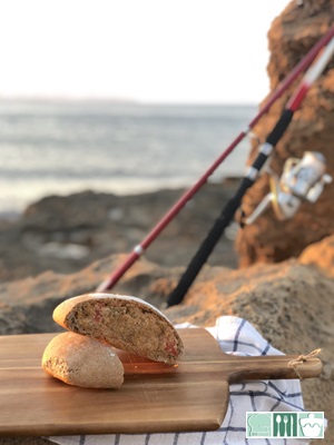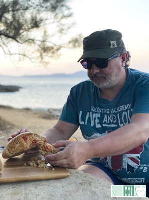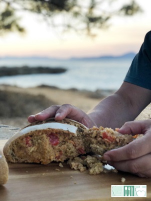 Su recuerdo también es de comerlo cortando trozos con las manos después de pescar (o no :), sin finuras, sin cuchillos... y como esta empapado, la corteza se reblandece y es como si comieras un pa amb oli con vistas y olor a mar!