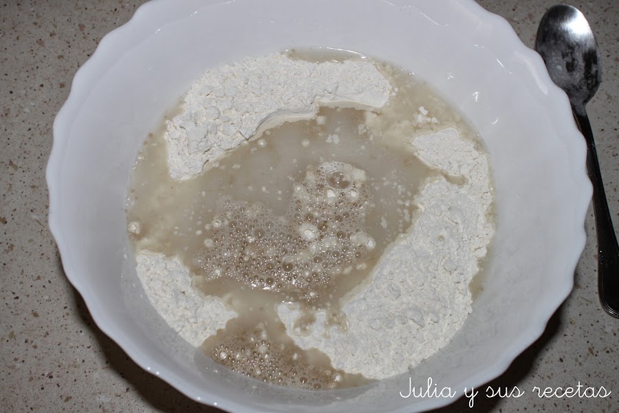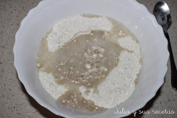 Ponemos en un bol la harina, la sal y la levadura mezcladas, (si es fresca tenéis que disolverla en el agua templada antes de ponerla en la harina), añadimos el agua templada.