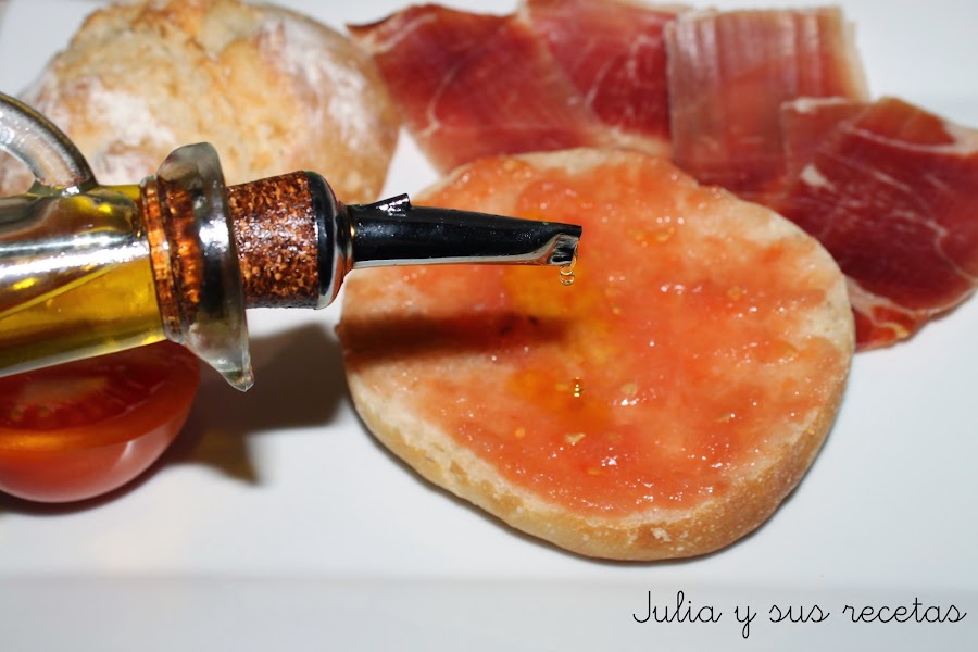 Partimos el pan por la mitad, lo untamos con el tomate, le ponemos una poquita sal, y un buen chorreón de aceite de oliva.