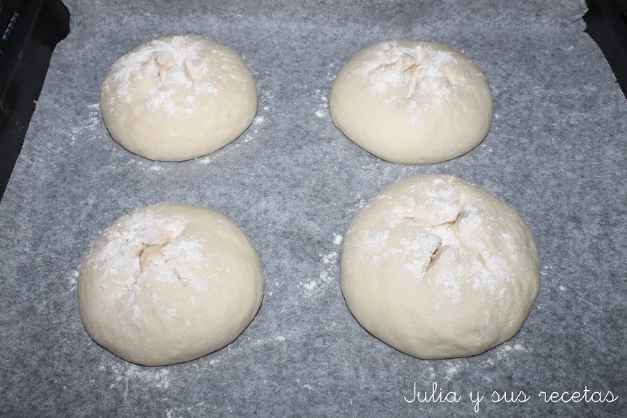 Las dejamos reposar tapadas hasta que doble su volumen, 1 hora aproximadamente. Pasado el tiempo los espolvoreamos con harina y con la tijera de cocina le hacemos arriba del bollito unos cortes en forma de cruz