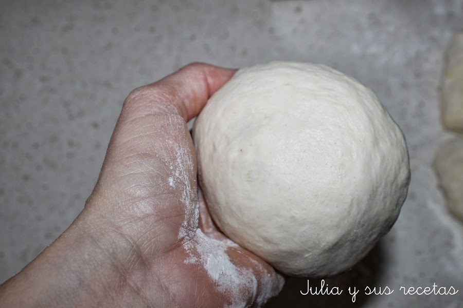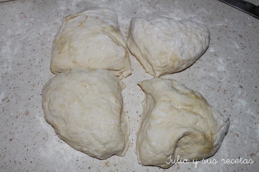 Pasado el tiempo, la sacamos la partimos en cuatro trozos iguales y vamos formando bolas con las manos enharinadas.