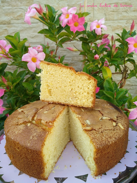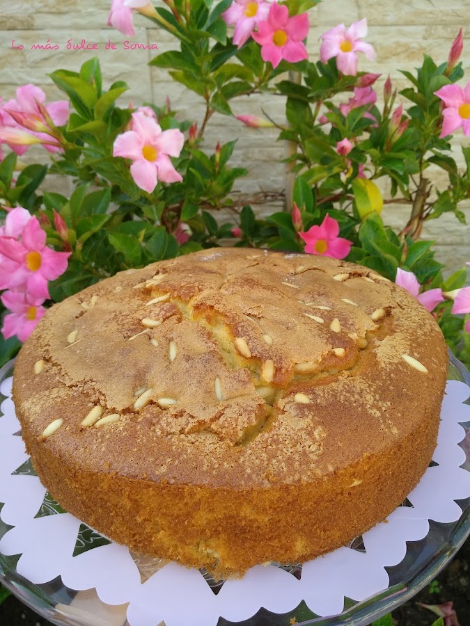 Cuando tengamos la pasta bien mezclada la ponemos en el molde y por encima ponemos los piñones (escurridos) y esparcimos azúcar por encima.