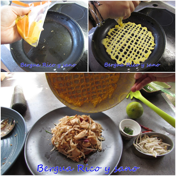 Si es la primera vez que la haces, te aconsejo que lo hagas antes de empezar con el resto del pad thai. Necesitarás un dispensador de cocina (una botellita de plástico con boquilla fina), pero también puedes hacer un agujero finito en el tapón de una botella pequeña e agua, o incluso usar una bolsa pequeña de plástico y cortar un agujero chiquitín en la punta.