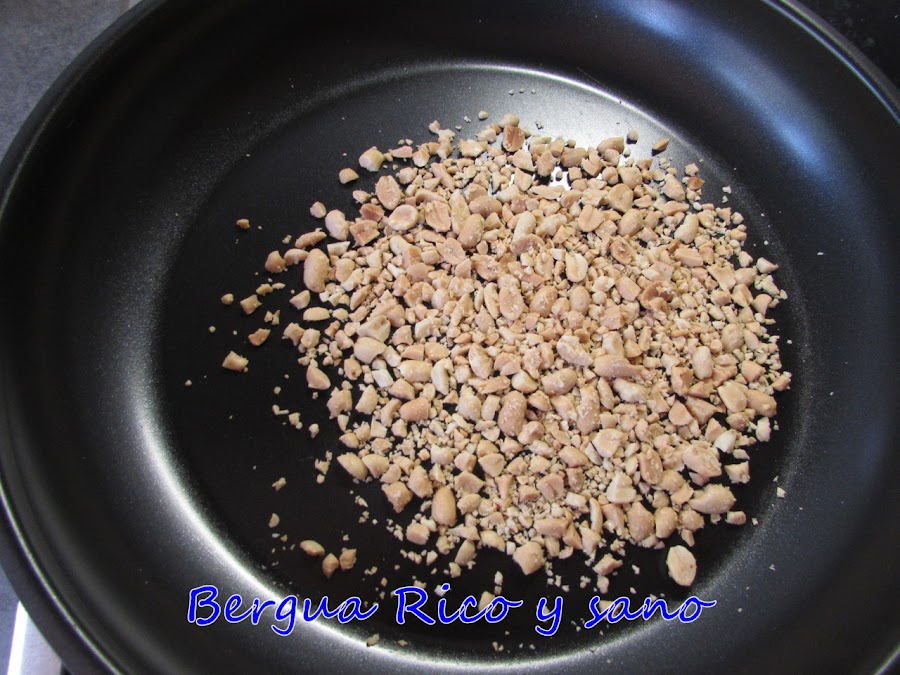 3. Picamos o troceamos en el mortero los cacahuetes y los tostamos un poco en la sartén, sin aceite y con mucho cuidado de que no se nos quemen o arruinarán el sabor de todo el plato. Reservamos.