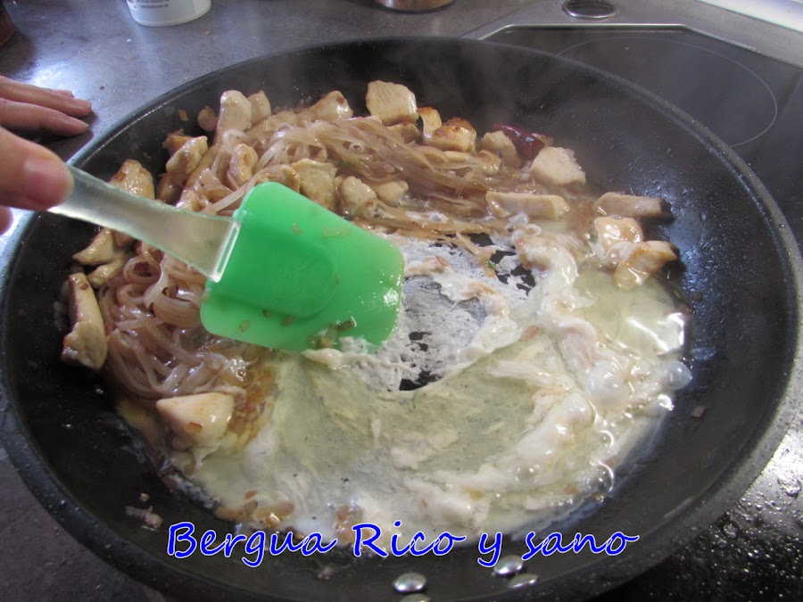 8. Hacemos a un lado los tallarines y rompemos los huevos en la sartén, removemos para que se cocine un poco y mezclamos bien con los tallarines y el resto.