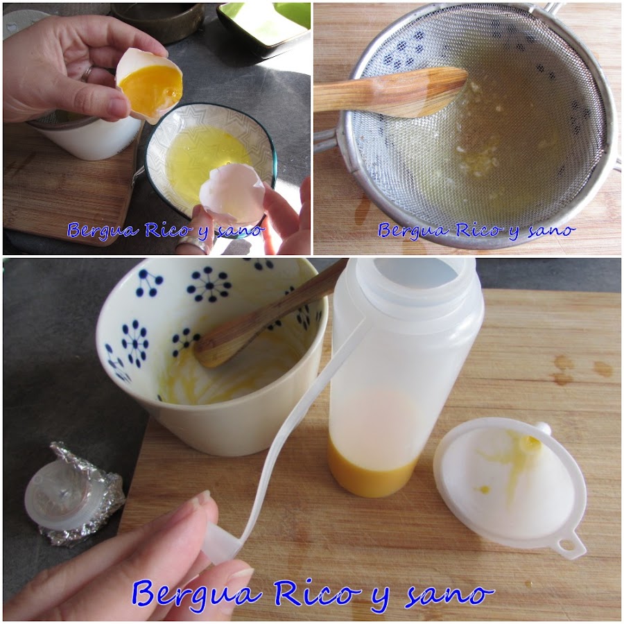 11. Primero separamos las yemas de las claras y filtramos las yemas con un poquito de sal; podemos filtrarlas en una tela de cocina o simplemente con un colador y removiendo con una cuchara de madera o algo con lo que podamos presionar. Así nos desharemos de grumos y restos de clara. Llenamos la bolsa o la botella.