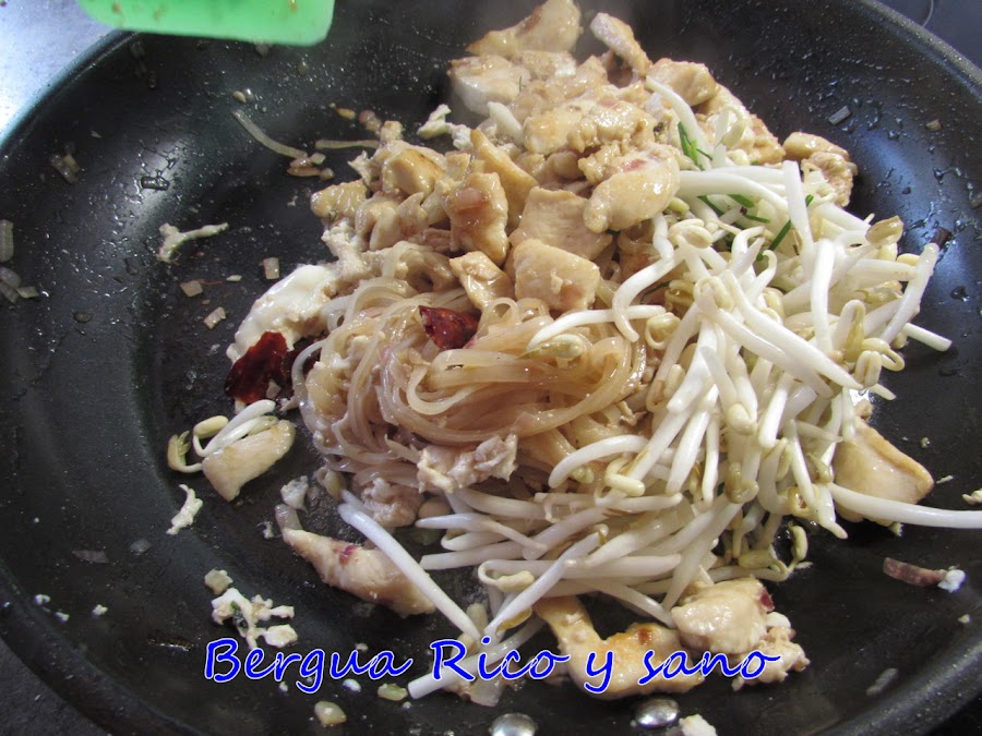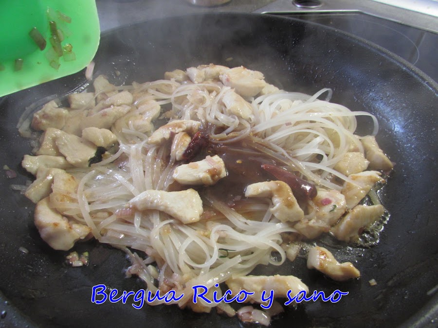 6. Calentamos una cucharada de aceite en la sartén a fuego vivo y añadimos la chalota picada, el ajo muy picado o prensado y el pollo; en seguida incorporamos los tallarines escurridos y removemos para que no se pegue nada.