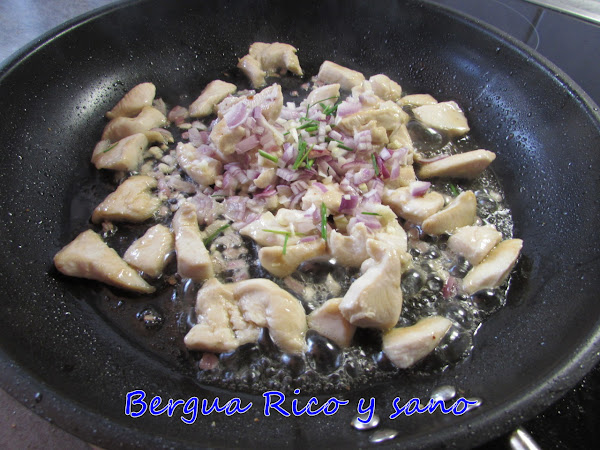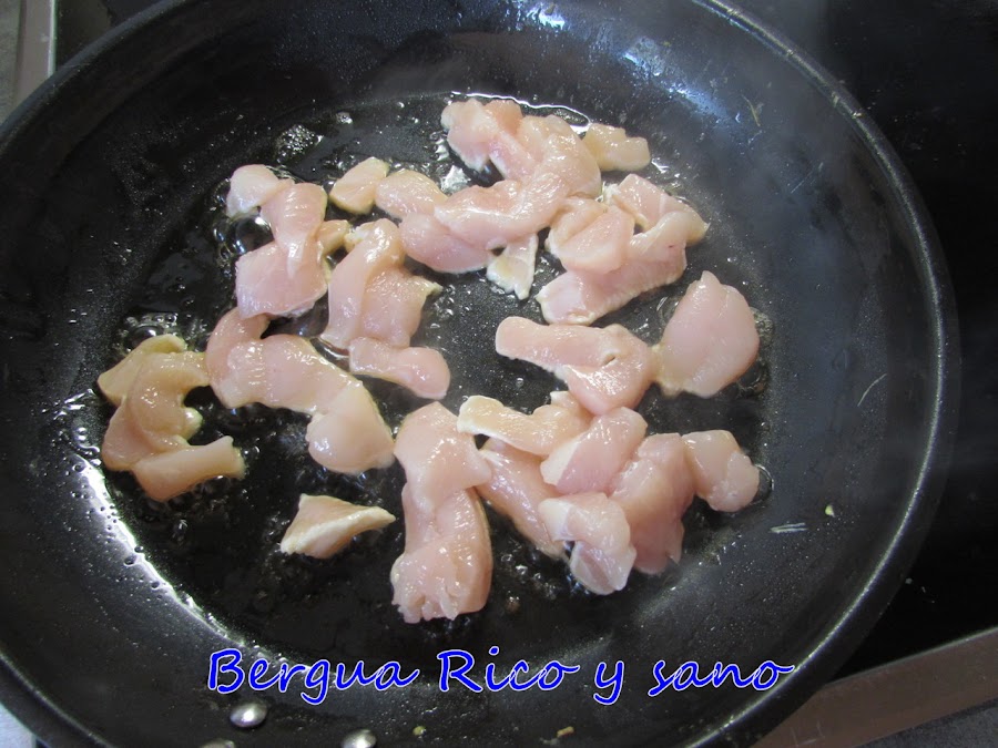 4. Cortamos el pollo diagonalmente en trozos finos y pequeños, unos 2,5 cm. Doramos con un poco de aceite y reservamos; esto es para darles color, luego volverán a la sartén.