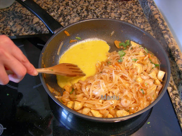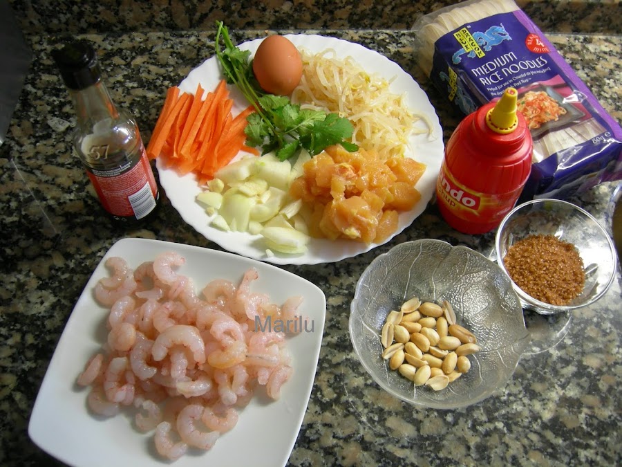 Después de estar mirando un montón de recetas, me he decidido por hacer un Pad Thai a mi manera.. Este plato lleva salsa de pescado y salsa de tamarindo... pero como me fué imposible encontrarlas,, he optado por una versión, con salsa de soja.... Espero os guste..