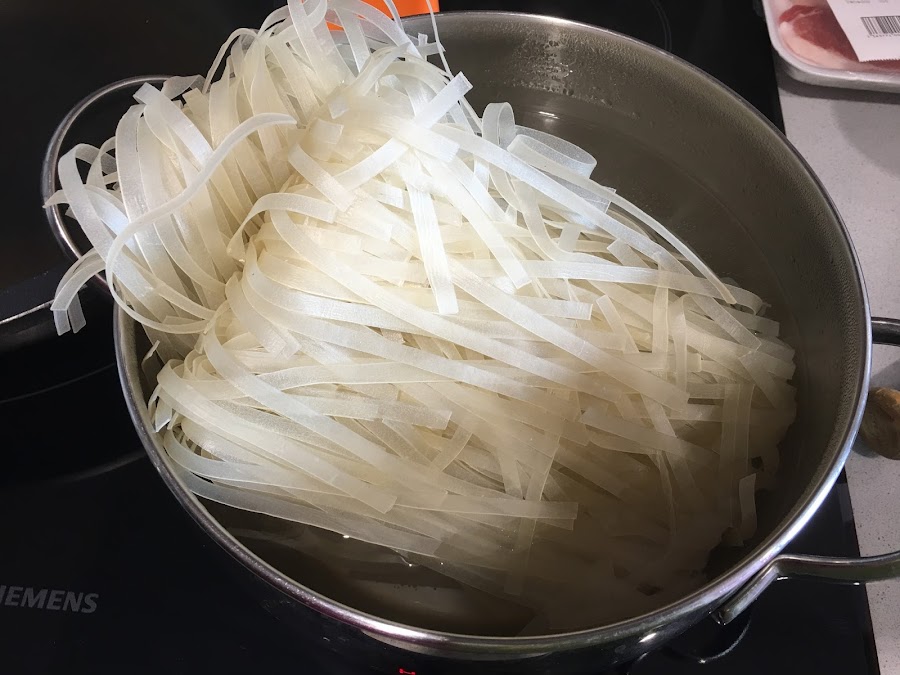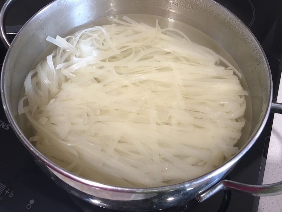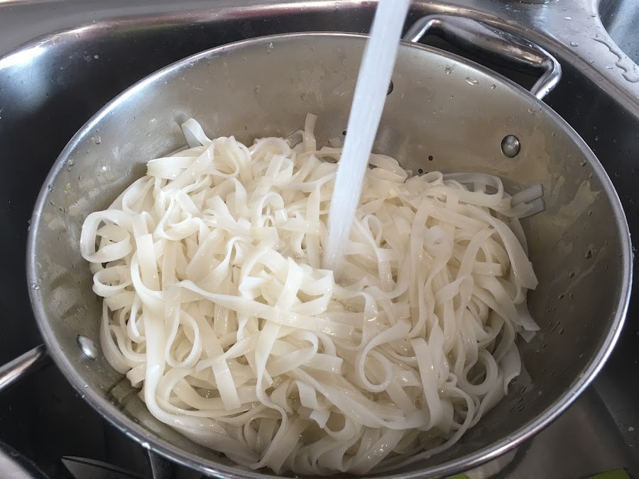 1. Pon los fideos a remojo en agua muy caliente unos 15 minutos, hasta que se ablanden. Escúrrelos.