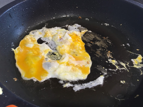 4. Añade el huevo, extiende y fríe unos 1 o 2 minutos, hasta que cuaje. Retira el huevo y córtalo en tiras finas.