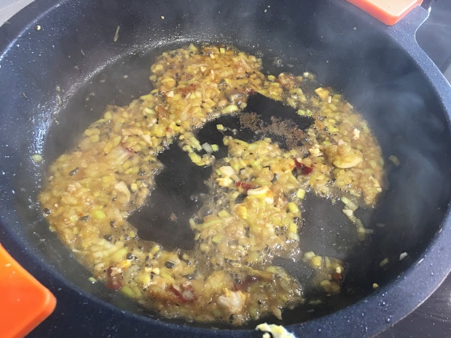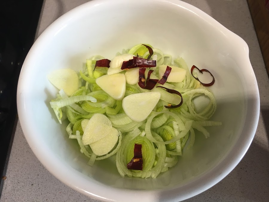 2. En un mortero, maja la guindilla, el ajo y la cebolleta.Añade al cuenco el tamarindo, el azúcar, la salsa de pescado y el zumo de lima. Remueve bien y reserva.