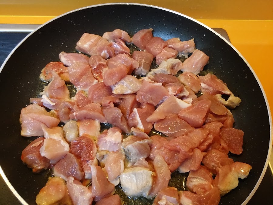 Dejamos que se poche todo y en una sartén vamos a freír el magro de cerdo.