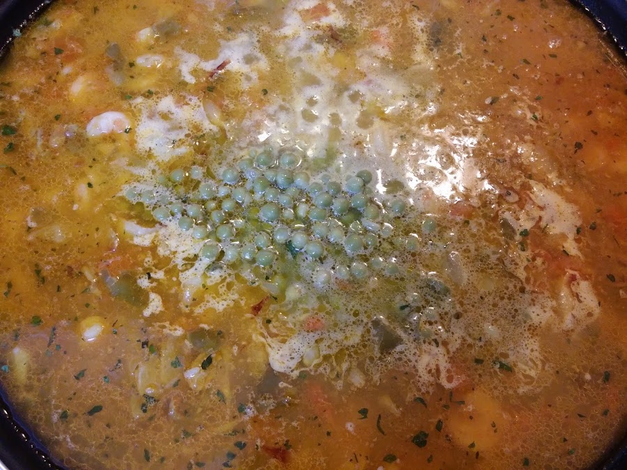 Removemos bien y añadimos los guisantes y el colorante.