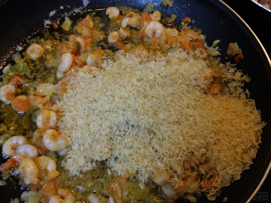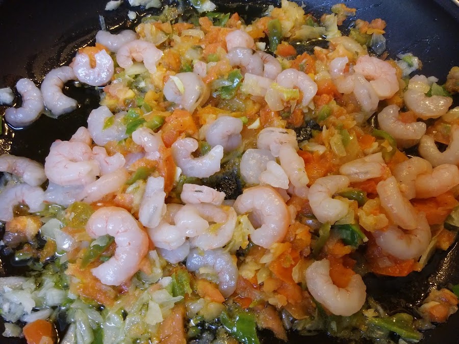 En la paellera añadimos las gambas peladas y ya descongeladas.