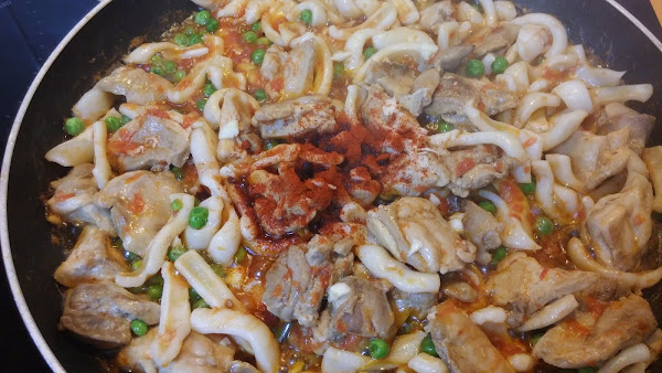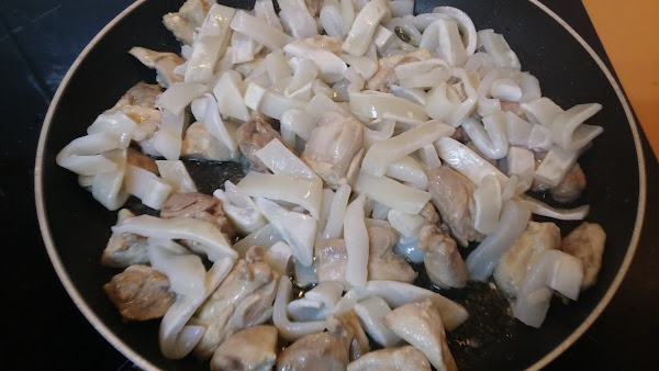 Cuando esté medio doradito, añadimos las anillas de calamar partidas en dos o tres trozos. Dejamos que se vaya haciendo todo.