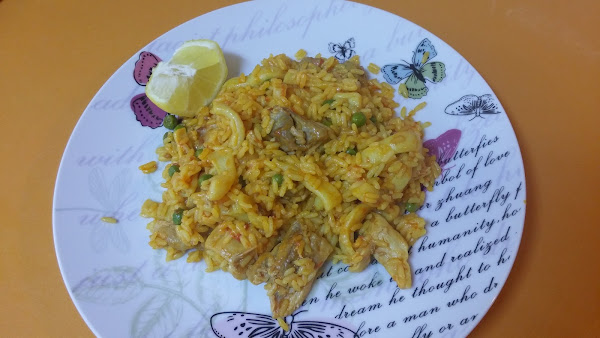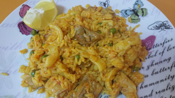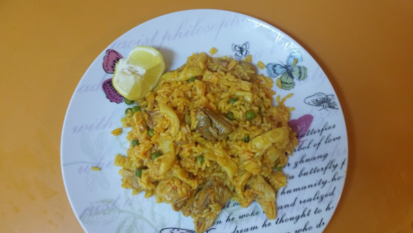 Salamos al gusto, subimos el fuego y cuando empiece a hervir añadimos el arroz y el azafrán; yo he usado un sobrecito.