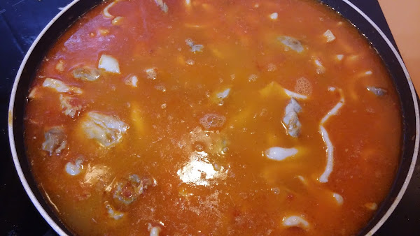 Y ahora cubrimos con el caldo de pescado. Con un litro es suficiente.