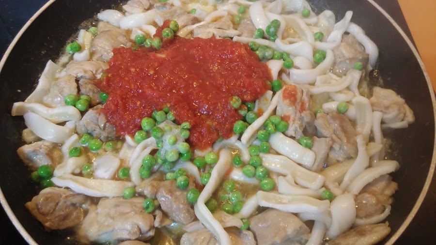 Y el tomate triturado. Removemos bien y dejamos freír unos 10 minutos.