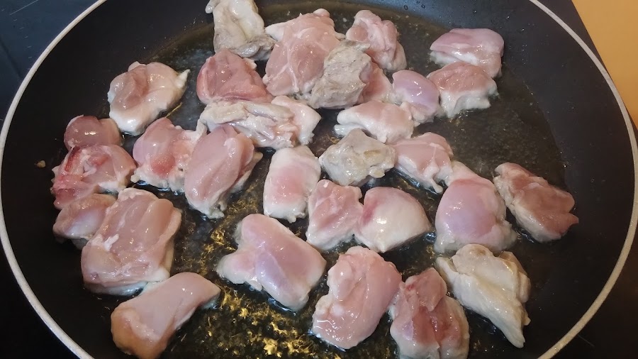 Ponemos un chorro de aceite en la paellera, calentamos y doramos el pollo, que habremos troceado.