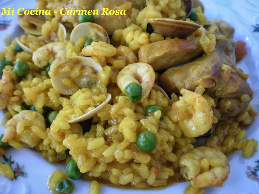 Con ellas, con unas gambitas, unas almejas de Málaga (fácil también de distinguir por su color y forma) y pollo de corral, preparé éste arroz, ¿puedo llamarle paella? Al que nada más destapar su olor y acabado me pidió a gritos que le hiciese una foto y lo compartiera con quienes siguen Mi cocina.