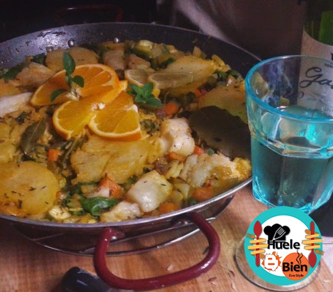 6.- Para que no se pegue el fondo, con un paño de cocina, sin quemarnos, agitamos de vez en cuando la paellera. Una vez terminado, dejamos reposar 5 minutos. Decoramos con unas rodajas de naranja, limón y unas ramitas de orégano fresco.