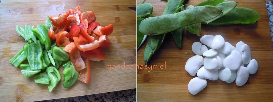 Trocea los pimientos y pela los bajocones. Limpia bien las alcachofas y déjalas sin hojas duras, pártelas en cuatro trozos y ponlos en agua con limón, esto es para que no oscurezca el arroz.