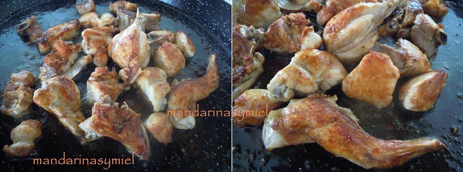 Cuando veas que ya está caliente, echa sal en el fondo y pon la carne a freír, añade los dos dientes de ajo sin pelar y con un corte en el centro. Cada uno tiene sus manías y formas de cocinar las recetas y con la paella también pasa; yo por ejemplo siempre pongo primero la costilla, la sofrío y cuando está casi hecha, la aparto a los lados y pongo el pollo y el conejo. Dora bien la carne hasta que esté dorada, bien doradita...esto es muy importante, "la base de toda paella está en el sofrito", un buen sofrito es muy importante para que la paella salga gustosa. En este momento yo le echo por encima de la carne un poco de romero seco, le da un sabor riquísimo, sino te gusta no se lo pongas. Cuando veas que en el fondo del paellón hay como una costrita del sofrito, es el momento de echar las verduras.