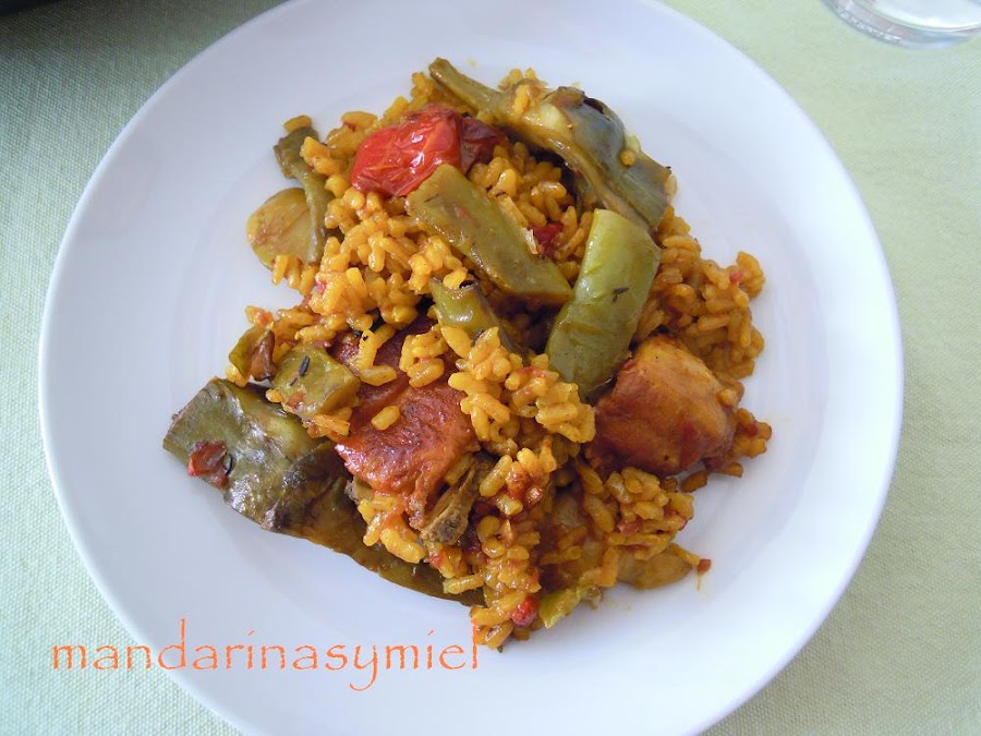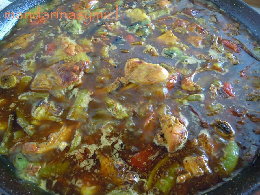 La paella puedes hacerla sin conejo, sin pato o sin costilla, pero nunca sin pollo. Hacía mucho tiempo que quería poner la receta de la paella porque es un plato que hago todos los domingos y alguna vez, entre semana también; pero preparo los ingredientes, pongo el paellero (es que tengo encimera y no se puede hacer), enciendo el fuego y cuando me doy cuenta ya nos la estamos comiendo y no he hecho fotos....bueno, pues otro día será....y así hasta que ví que Estela de La cocina de Estela, eligió como ingrediente para el reto Typical Spanish, el arroz. Entonces me dije que era el momento de ponerla, no hay plato más típico de arroz que la paella (por lo menos para mí), aunque hay muchos platos de arroz tradicionales con una gran variedad de ingredientes.