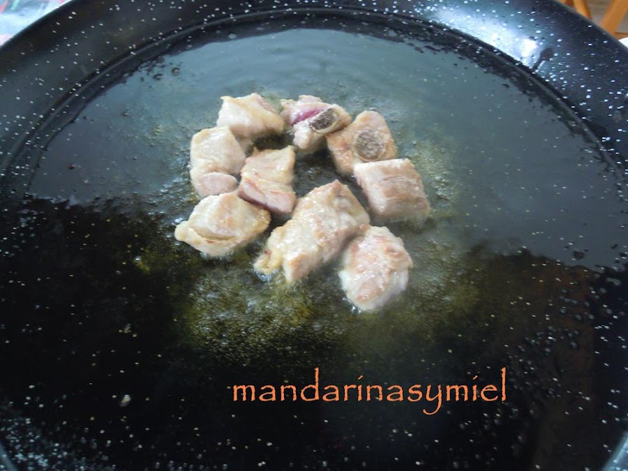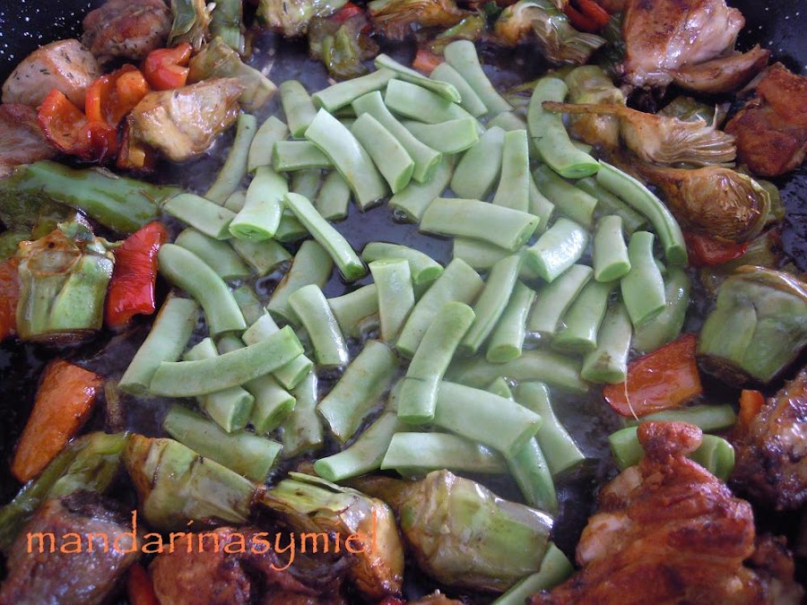 Cuando veas que ya está caliente, echa sal en el fondo y pon la carne a freír, añade los dos dientes de ajo sin pelar y con un corte en el centro. Cada uno tiene sus manías y formas de cocinar las recetas y con la paella también pasa; yo por ejemplo siempre pongo primero la costilla, la sofrío y cuando está casi hecha, la aparto a los lados y pongo el pollo y el conejo. Dora bien la carne hasta que esté dorada, bien doradita...esto es muy importante, "la base de toda paella está en el sofrito", un buen sofrito es muy importante para que la paella salga gustosa. En este momento yo le echo por encima de la carne un poco de romero seco, le da un sabor riquísimo, sino te gusta no se lo pongas. Cuando veas que en el fondo del paellón hay como una costrita del sofrito, es el momento de echar las verduras.