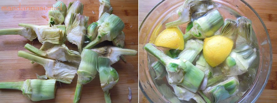Trocea los pimientos y pela los bajocones. Limpia bien las alcachofas y déjalas sin hojas duras, pártelas en cuatro trozos y ponlos en agua con limón, esto es para que no oscurezca el arroz.