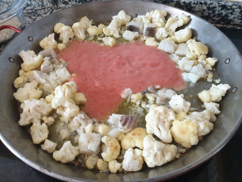 - Cortar la coliflor en ramilletes no muy grandes. Cortar el bacalao en trozos grandes. Rallar los tomates. Pelar y picar los ajos.