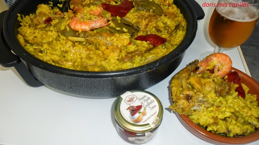 Poner la paella al fuego donde teníamos el pimiento con la otra mitad del aceite y el tomate pelado a trocitos, pochamos y agregamos los guisantes, algunas hebras de azafrán, ajo picadito y perejil seguir rehogando.