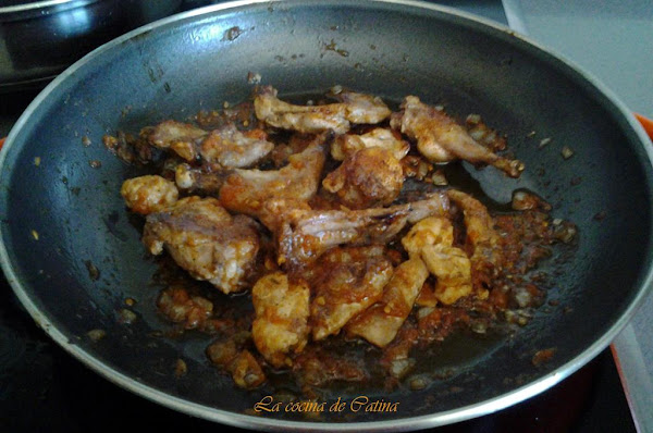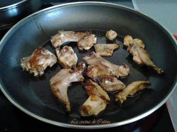Poner una paellera en el fuego con aceite y cuando esté caliente, echar el conejo y freírlo bien, hasta que esté dorado, a continuación sacarlo y reservarlo.