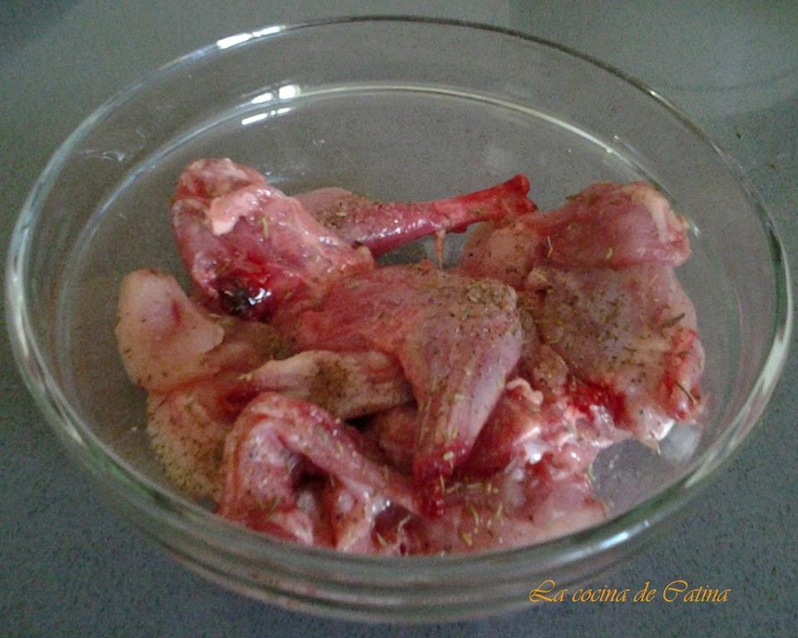 Trocear el conejo y ponerlo en un cuenco, añadir sal, pimienta molida, el tomillo, el romero y los cominos. Mezclarlo todo bien y dejarlo macerar durante toda la noche en el frigorífico.