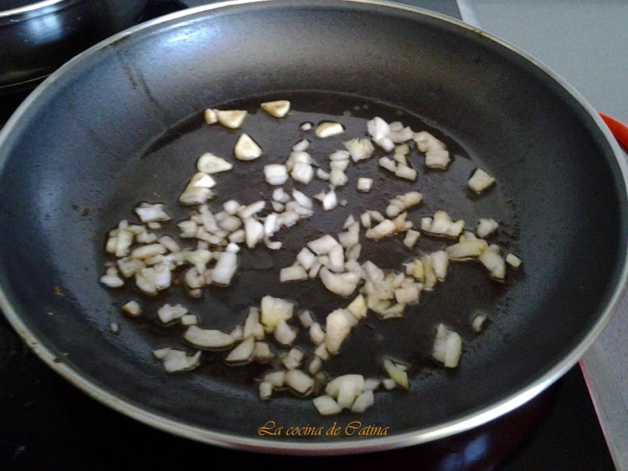 Pelar y picar la cebolla y los ajos. pelar el tomate, quitarle las semillas y picarlo.