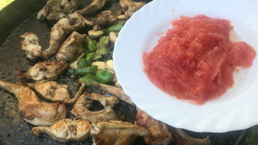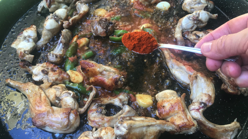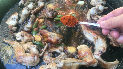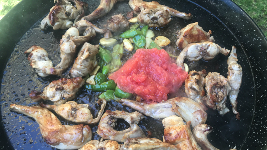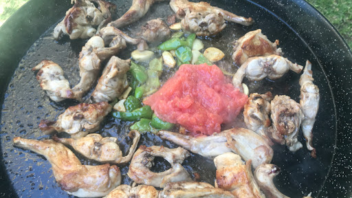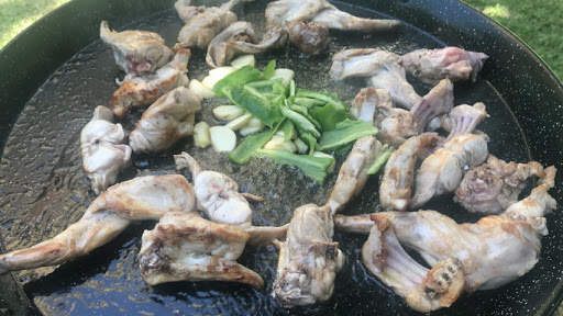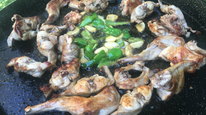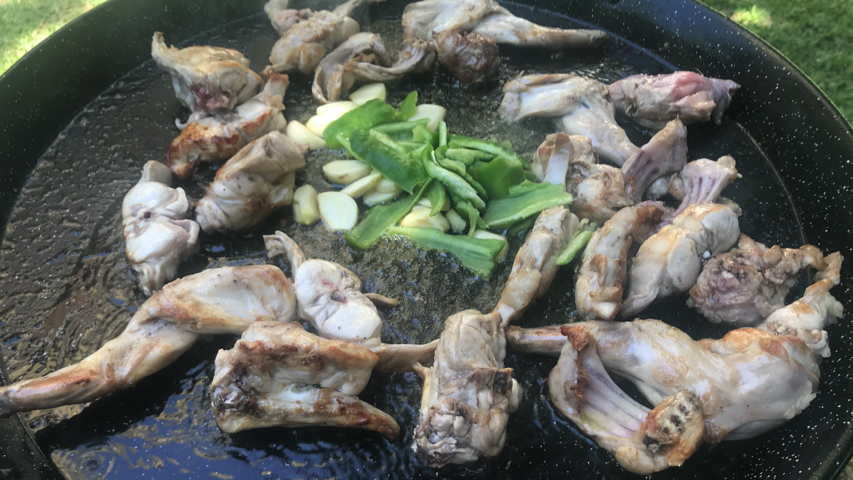 Cuando el conejo esté bien dorado, apártalo hacia los bordes de la paellera dejando libre el centro. Echa en el centro de la paella los ajos y el pimiento verde. Deja que sofría.