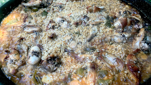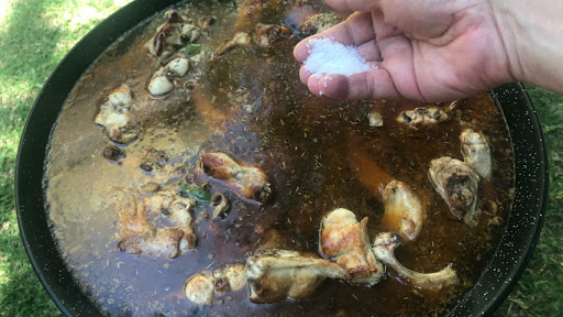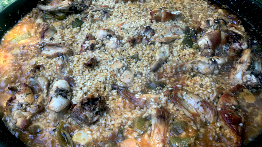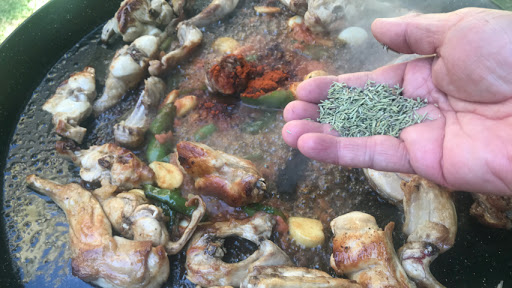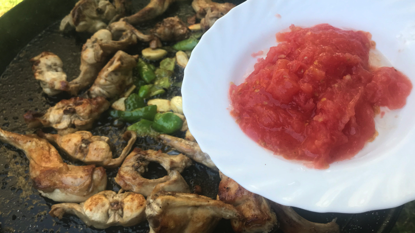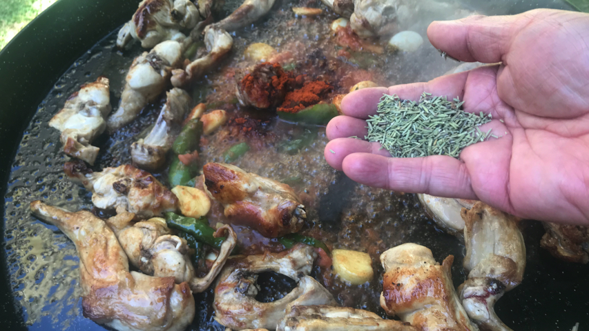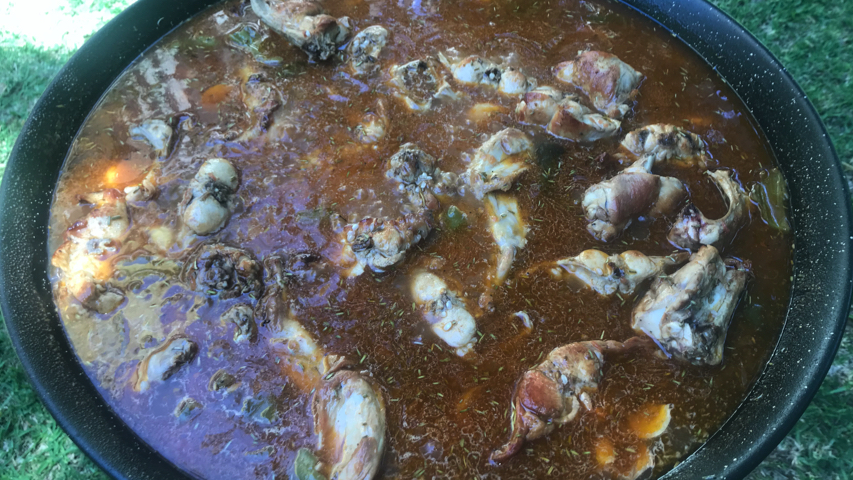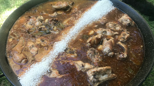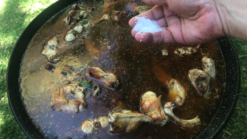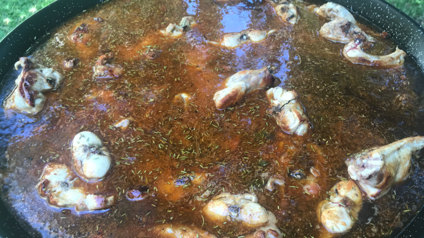Deja que el conejo cueza durante una media hora. El conejo se cocinará en este tiempo. Conseguiremos un caldo de conejo excelente y el líquido irá evaporando y descendiendo su nivel hasta quedar más o menos un dedo por debajo de los puntos de soldadura de las asas de la paella.