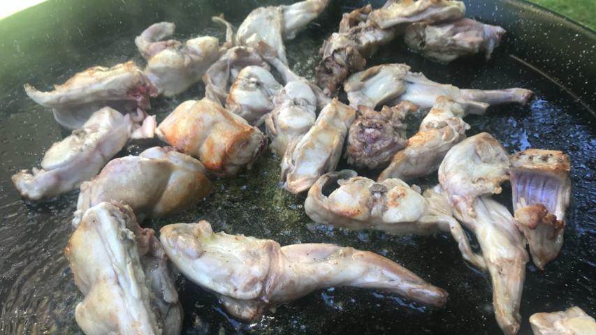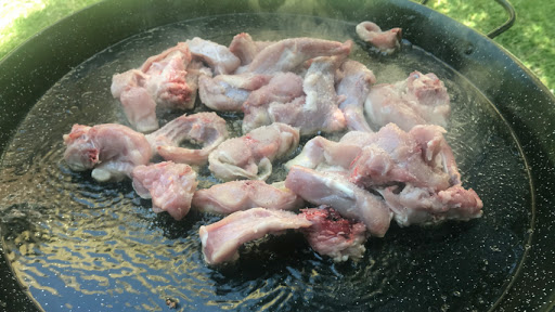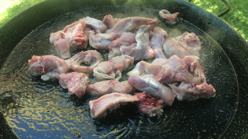 Prepara la paella a fuego alto con un buen chorro de aceite de oliva y sofríe las piezas de conejo salpimentadas.