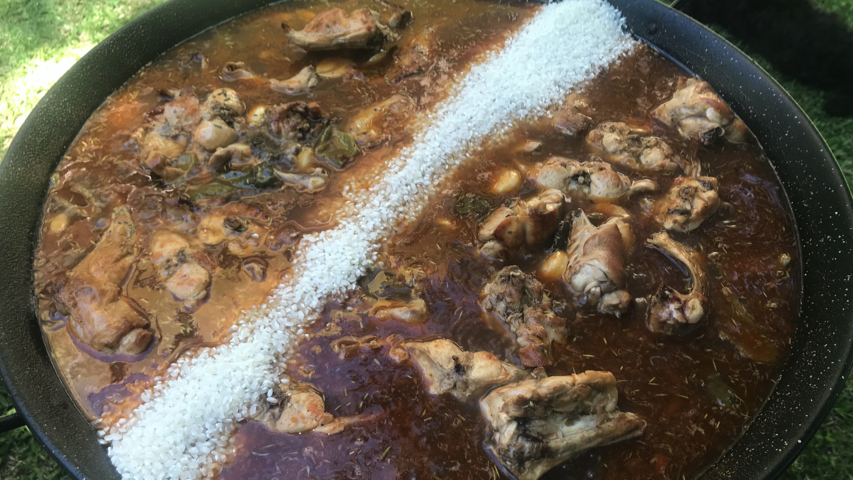 Añade el arroz usando el sistema del “caballón”: has una linea recta lo más estrecha posible a lo largo del diámetro de la paella. El arroz debe sobresalir del líquido como un dedo.