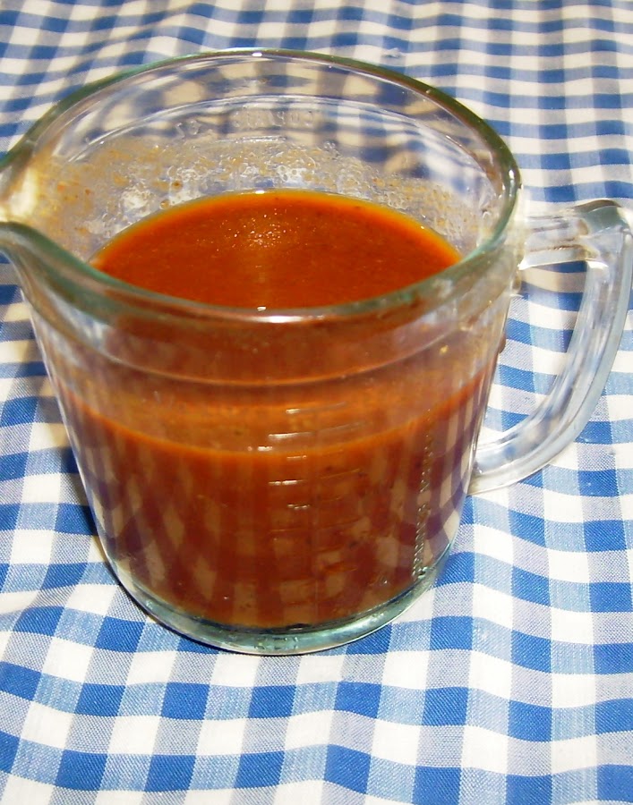 Quitamos las semillas al pimiento, lo ponemos en el vaso de la batidora con los ajos y un chorro de agua, trituramos.