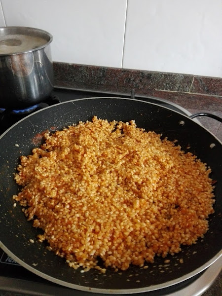 Las hebras de azafrán se disuelven en un vaso con un poco de caldo caliente y se añade al arroz.