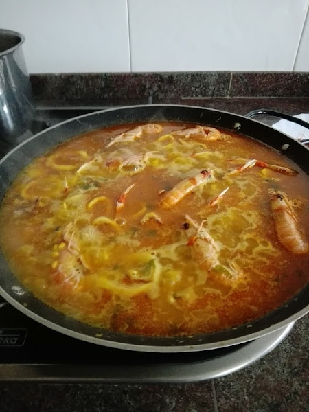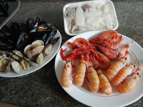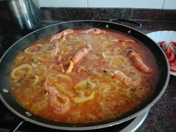 A los diez minutos de cocción agregar los escamarlanes, y por último las almejas, los mejillones y las gambas. Finalmente añadir un hilo de aceite de oliva por encima.