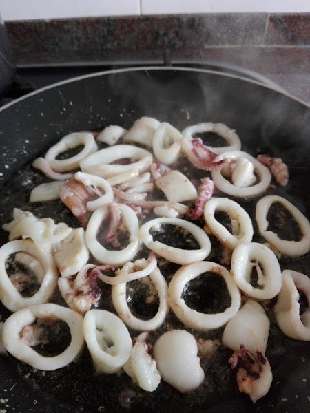 Limpiar la sepia y cortar en trozos. Limpiar el calamar y cortar en aros.
