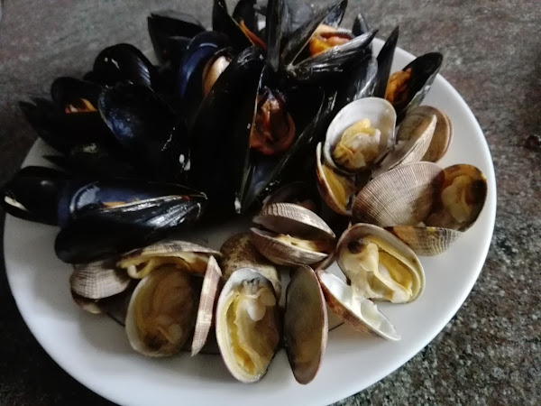 Cocer al vapor con un poco de agua las almejas y guardar el agua y añadir al caldo.