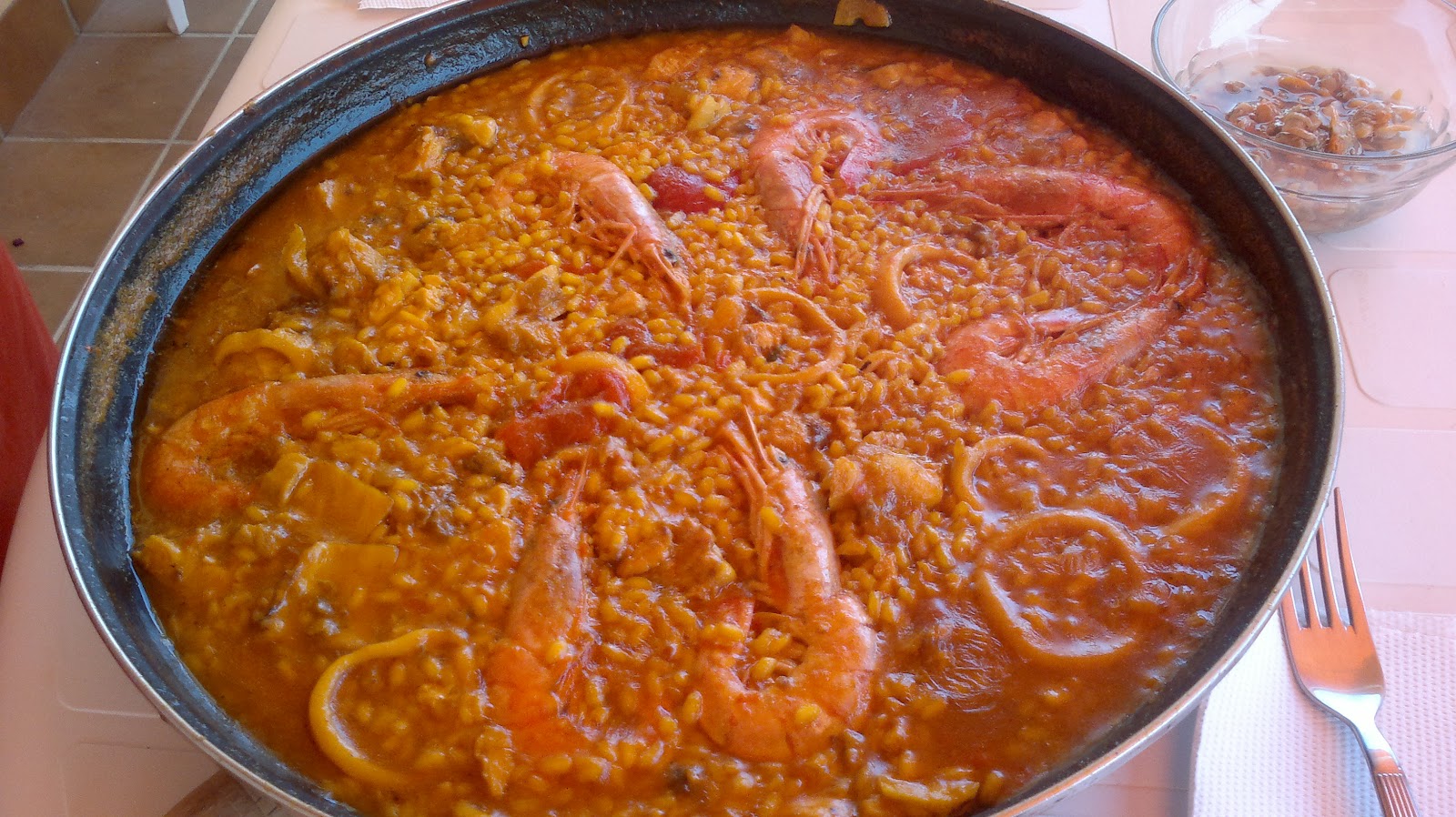 Primero rehogamos las gambas en la paellera, se apartan para añadirlas al final, doramos tambien el emperador troceado y reservamos, freimos el pimiento y cuando este medio hecho se añade un tomate picadito con ajo y perejil tambien picado, se sofrie todo y se le añade una punta de pimenton,se añaden las almejas y se rehogan un poco, dp añadimos caldo de pescado (en su defecto agua) cuando rompa a hervir se prueba para ver el punto de sal, se añade el azafran o colorante y el arroz, se va haciendo a fuego medio moviendo la paellera de vez en cuando, cuando el arroz este meloso se ponen las gambas y el emperador que habiamos reservado.